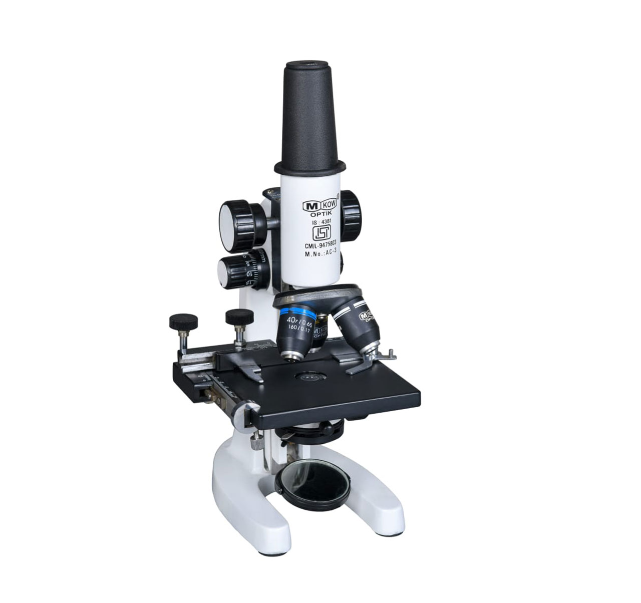 • Fine Motion With Graduated Drum .002mm Accuracy , With Stop Arrangement, Two Lens Bright Field Condenser N.A 1.25 Moveable On Rack & Pinion,  Detachable Two Way  Mechanical Stage Having Travel Range 50×75 Mm With Graduating Scale & Vernier